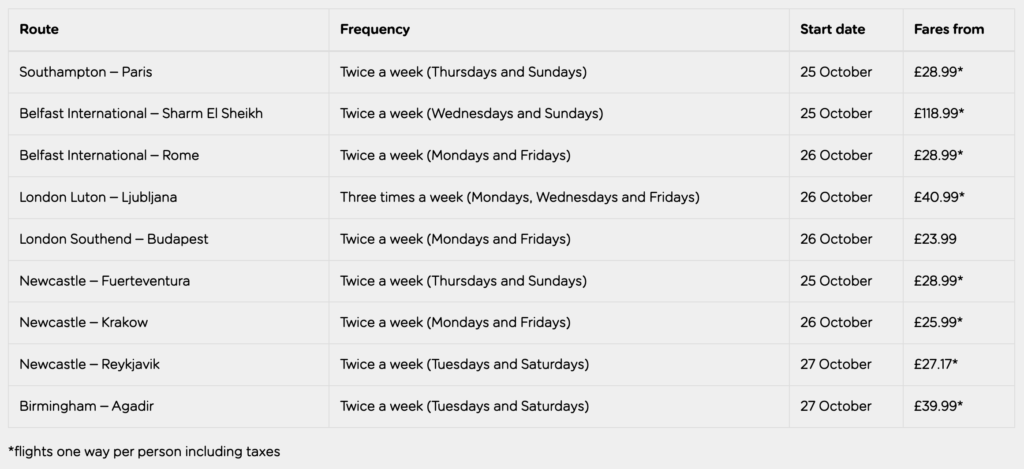 Next, let us look at the full list of new flights. Thus, you can easily plan your next trip. Here are the destinations, flight days, and start dates: